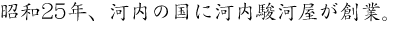 河内駿河屋は京都先斗町駿河屋より正式に暖簾分けを受け、昭和25年この「河内の国」大阪市東住吉区で創業いたしました。