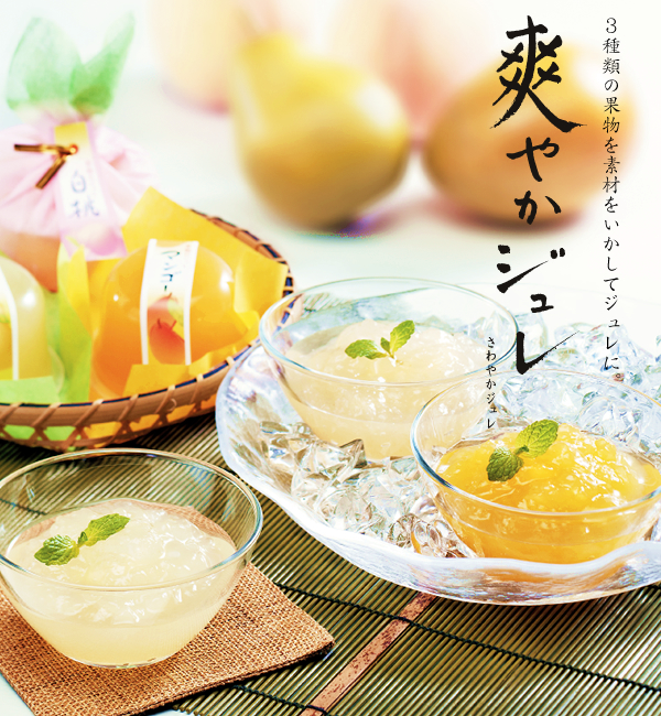 3種類のそれぞれの果物が深い味わいの「爽やかジュレ」をお楽しみ下さい。