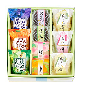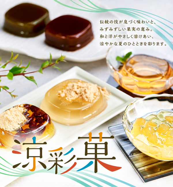 伝統の技で風味豊かに作り上げた「わらび餅」。まろやかな口あたりの「水ようかん」。新鮮な果汁を丸ごととじ込めた「フルーツゼリー」。和と洋が織りなす涼菓の彩りをお楽しみください。
