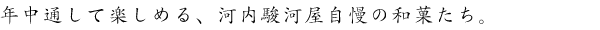 四季折々の季節商品とは別に、河内駿河屋の通年お買い求めできる商品です。 羊羹はもちろんくずもちやカステラ、羊羹、焼き菓子、ゼリーなど河内駿河屋自慢の商品をバランスよく組み合わせた詰め合わせセットなど幅広い商品がございます。