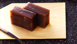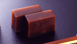 河内駿河屋の煉羊羹は透明感と独特の紅色に特長があり、見た目も味わいも茶席などに最適と高い評価を頂いております。末永くご愛用ください。